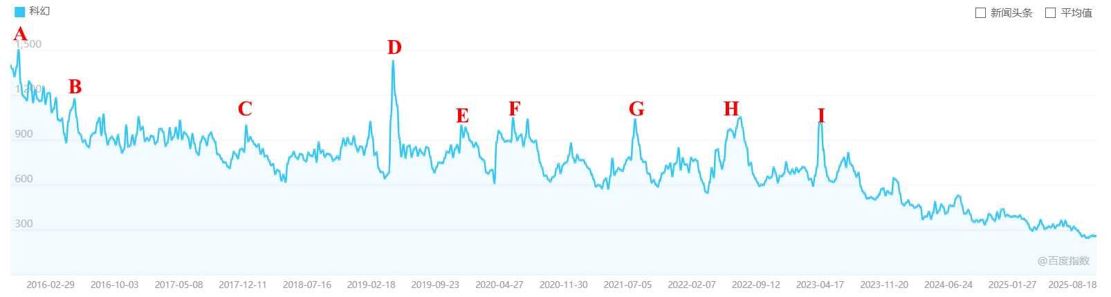 在百度搜索指数中查找“科幻”,从2015刘慈欣获得雨果奖到如今十年,搜索的数目整体呈下降趋势(不必多说)。但在下降的曲线中,我们可以看到几处搜索量变化的极点。在互联网进行搜索后,可以得到这几个极点发生的事件: