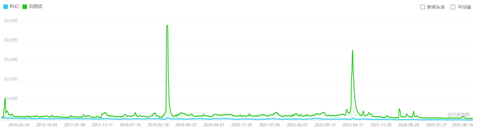 这说明,在圈外人——或者说大众来看,只有满足这些tag的事件或作品能被收到关注。而刘慈欣本人的作品风格,就几乎塑造了大众对“科幻”这个词语的定义。