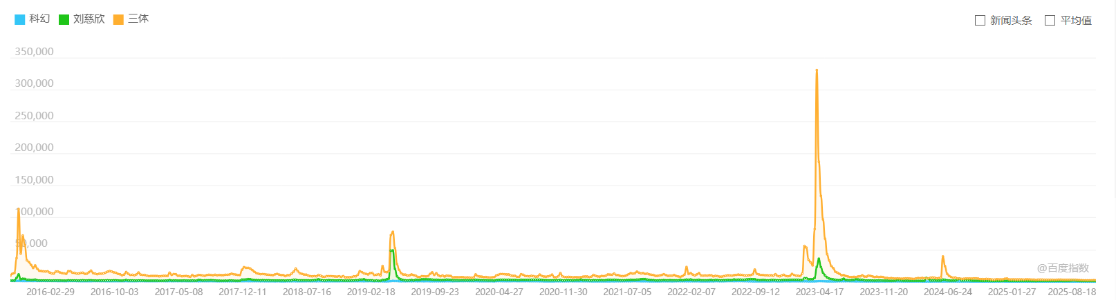 可以看到,在中国科幻圈产生热度的事件,大部分都是影视剧集,而且还要和刘慈欣相关。本来想象当中的世界科幻大会,《宇宙探索编辑部》等科幻大事件,在搜索热度榜中甚至处于低谷期。